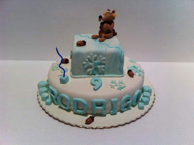 Massa de pão de ló húmido, recheado com chocolate e noz e coberto com pasta de açucar.